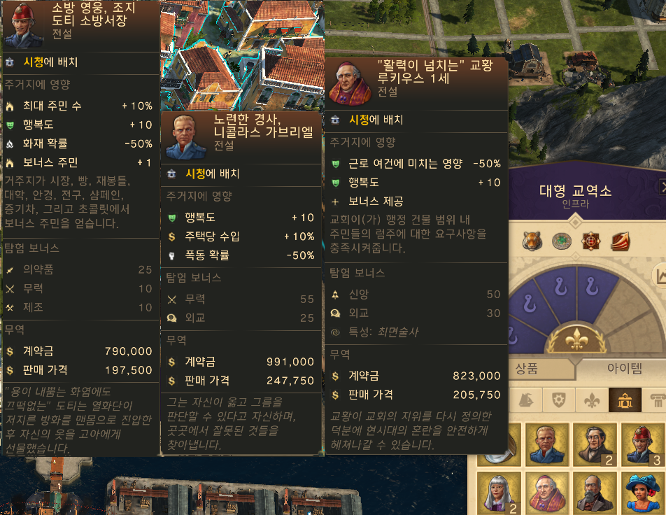 신대륙의 커피 같은 경우에는 아무리 효율적으로 건물을 배치하고 생산 시설을 늘려도 공급이 수요에 못 미치는 상황이 자주 발생해요. 때문에 노동자를 쥐어짜서(+50%)라도 생산량을 늘리게 되는데 이렇게 해버리면 폭동이 자주 발생하게 돼요. 그럴때 교황을 배치하면 그럴 확률이 큰폭으로 감소하게 되서 안정적인 운영이 가능해져요.