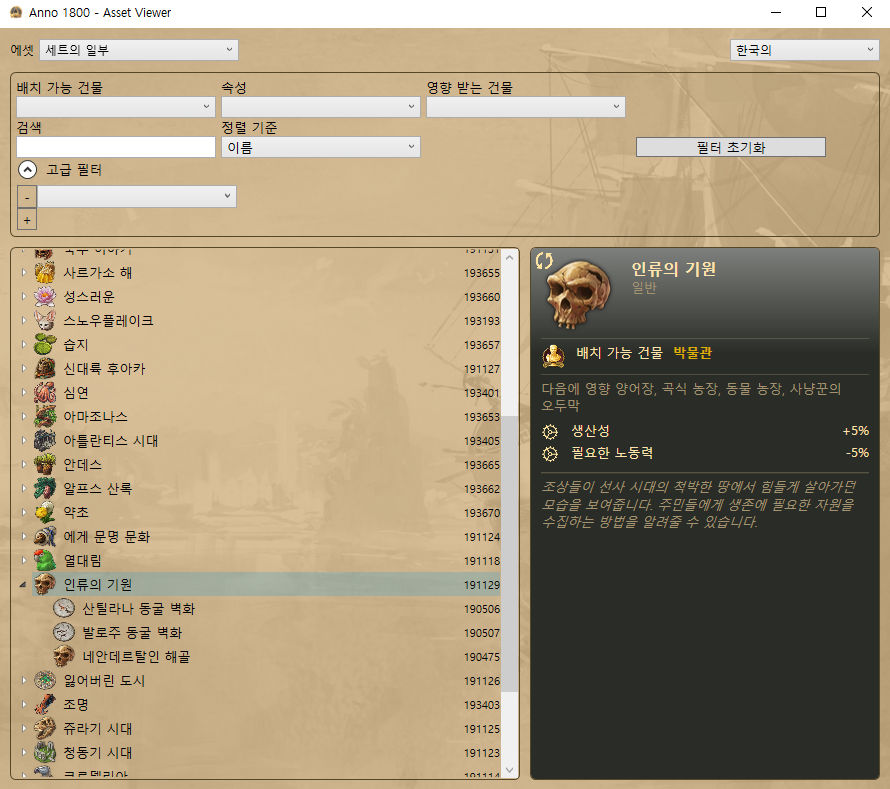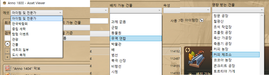 Asset Viewer 란 아노 1800에 존재하는 모든 아이템을 손쉽게 확인할 수 있게 해주는 아이템 탐색기(=사전) 같은거라고 보시면 돼요.