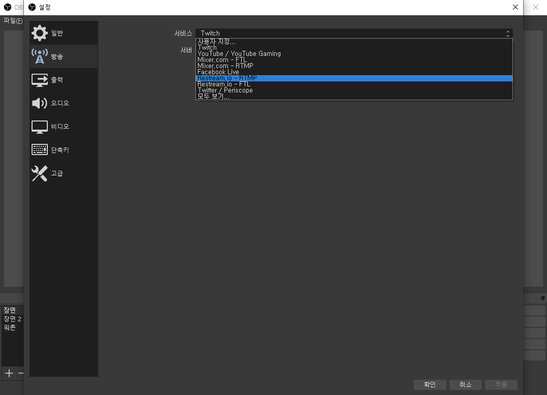3. 서비스 : Restream.io - RTMP를 선택해주세요.