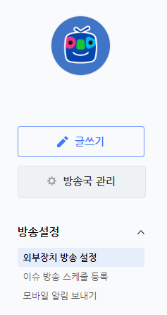 본인의 방송국 화면 우측 중간쯤에 있는 "외부장치 방송 설정"을 눌러주세요.