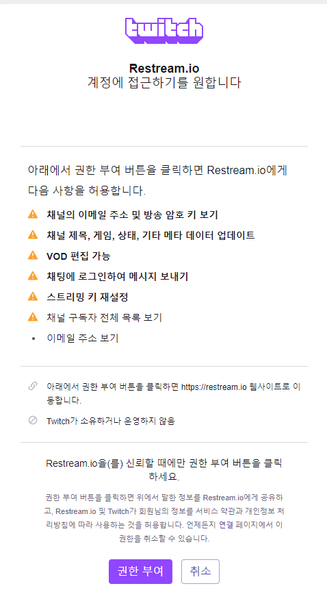 트위치에 로그인 된 상태라면 곧바로 본인 아이디에 접근 권한을 허용할 것이지에 대해 설명하는 페이지가 나와요.