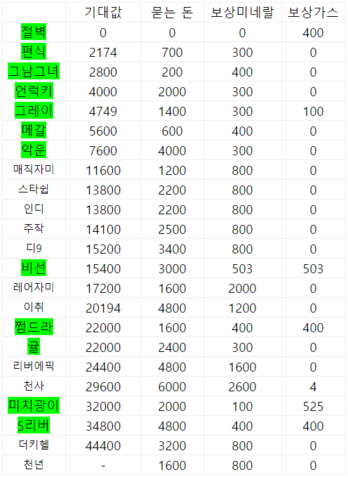 초록색으로 칠해진 항목은 초반부 : 수행하기 쉬운 미션 / 후반부 : 보상인 가스인 미션이다.