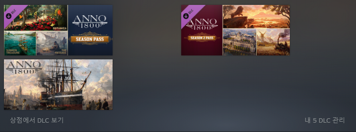아노 1800 본편 + 시즌패스 1 (가라앉은 보물 & 식물원 & 북극) + 시즌 패스 2 (권력의 중심지 & 선진농업) 이렇게 총 5개의 DLC가 있는 걸 확인할 수 있어요.