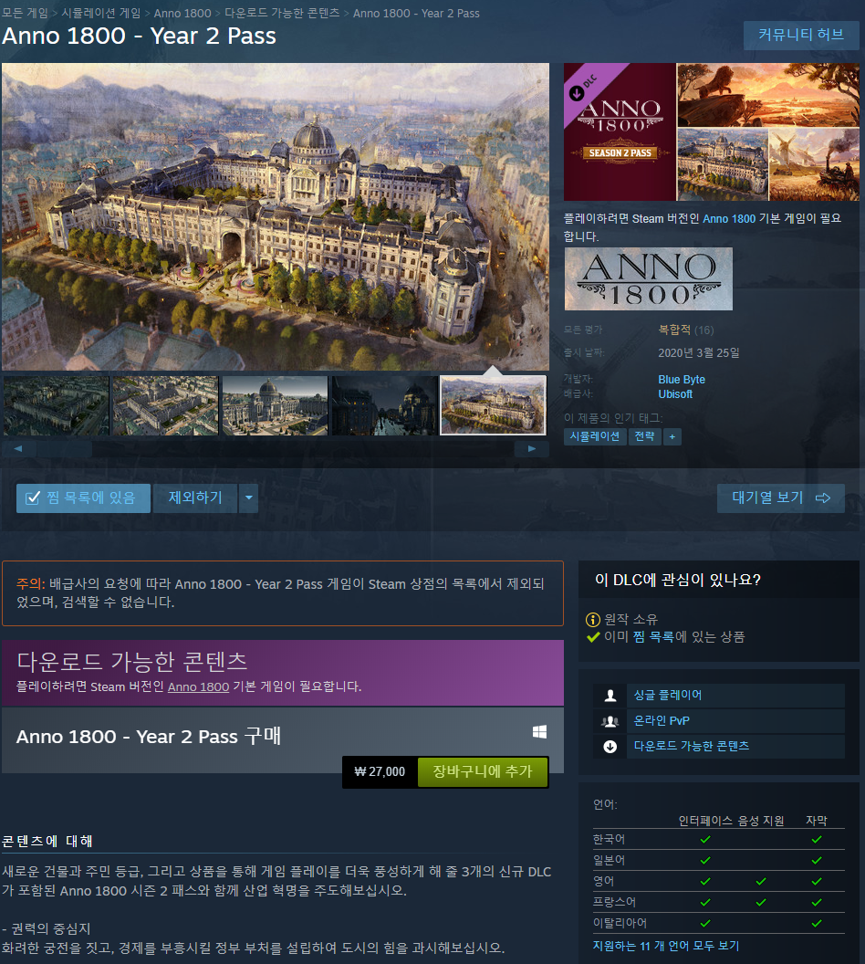 참고로 아노 1800 시즌패스 1&2는 스팀 상점 페이지에서 숨겨져 있기 때문에 일반적인 검색으로는 찾을 수 없어요.