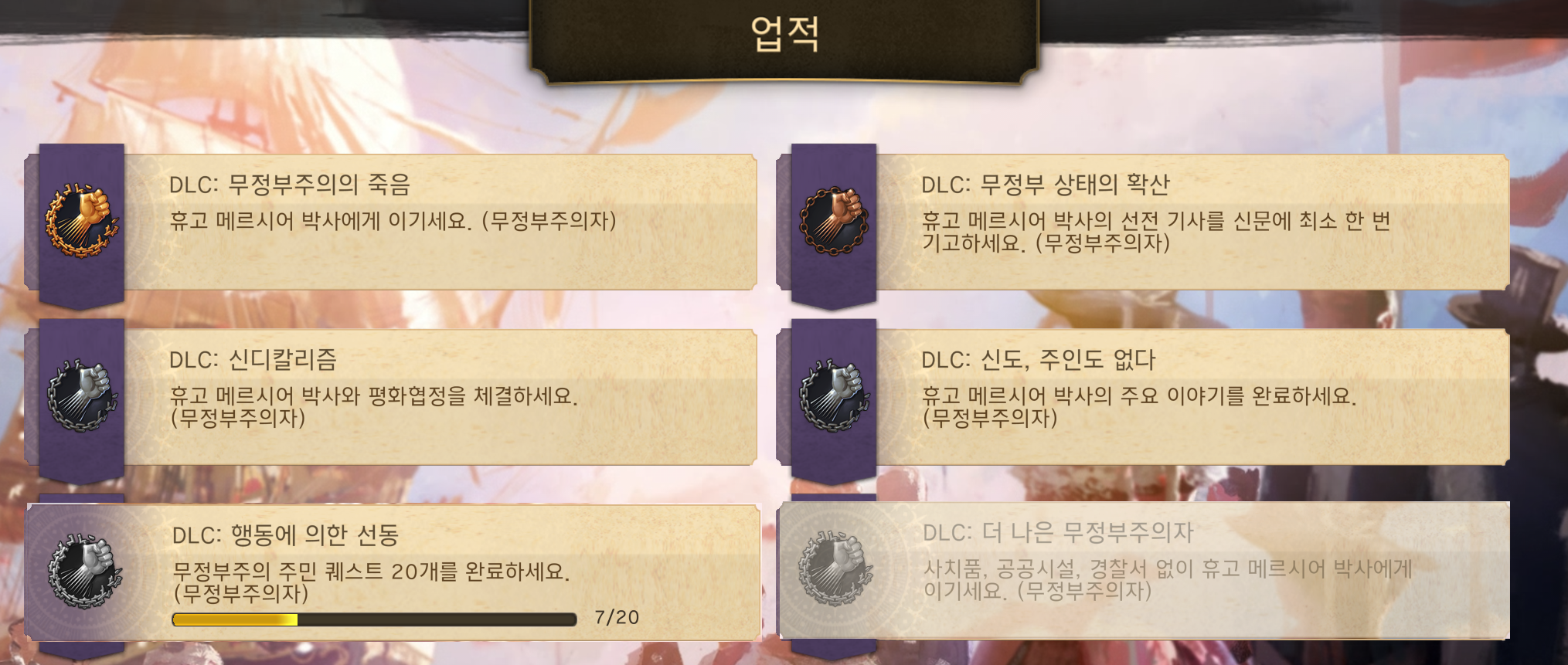 무정부주의자 DLC를 구입하면 관련 업적 6개가 추가돼요.
