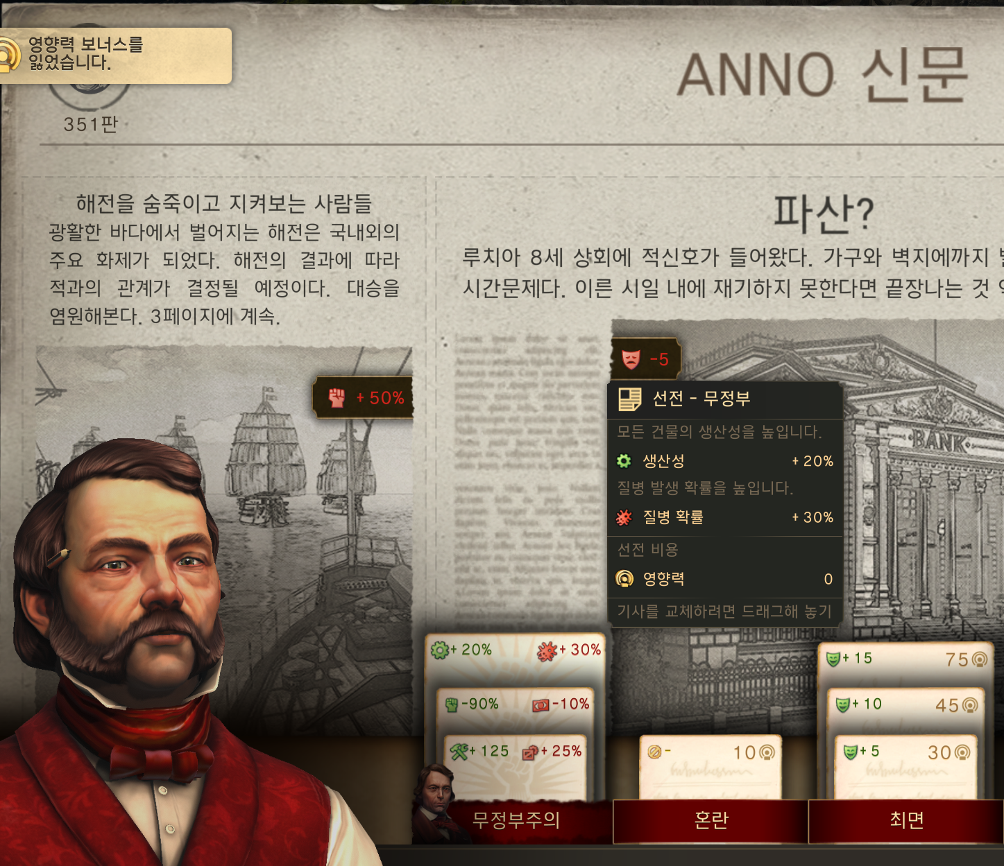 또, 무정부주의 관련 신문 효과도 추가돼요. ...그런데 사실 크게 쓸데는 없어요. 기존에 있던 효과들의 하위호환 같은 느낌이에요. 그나마 쓸만한 점이라면 영향력 소모가 없다는 점 정도 ...?
