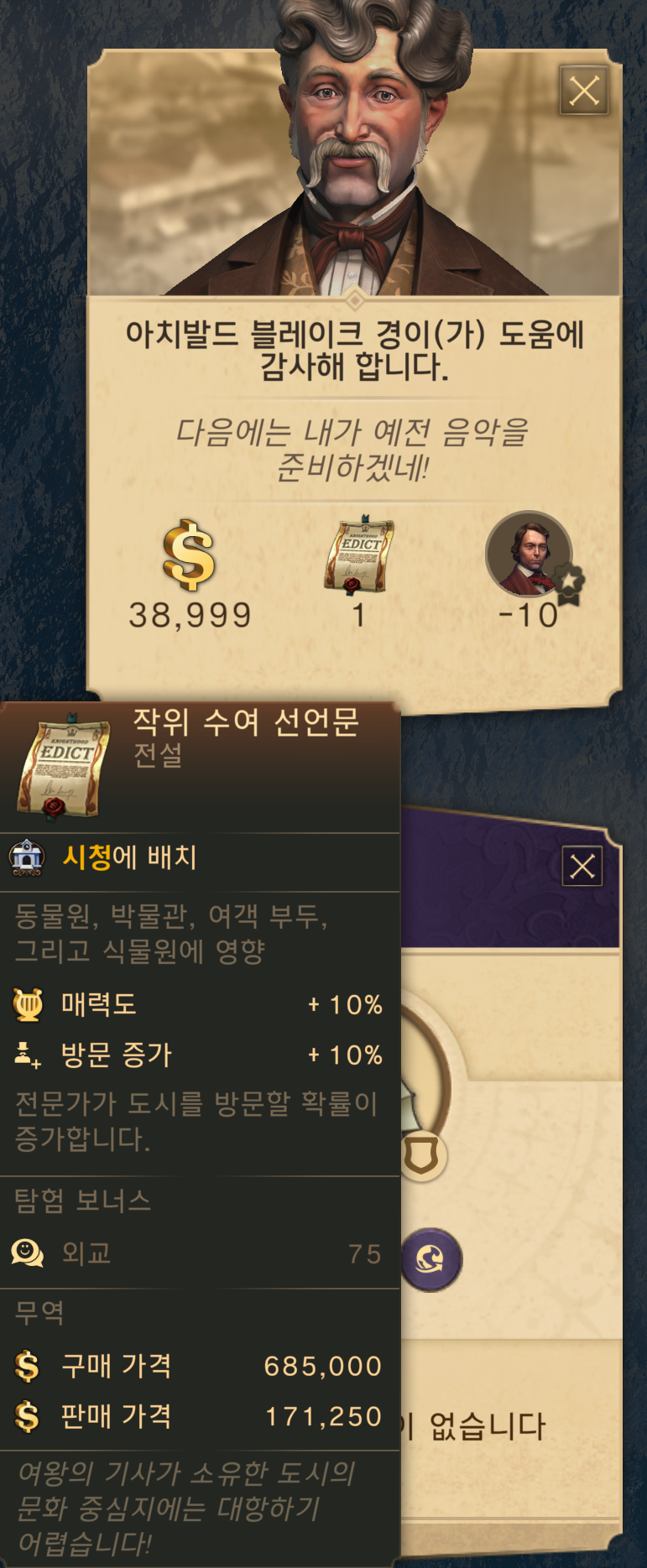 폭동 확률 -90% 하락 / 세금 수입 -10% 하락