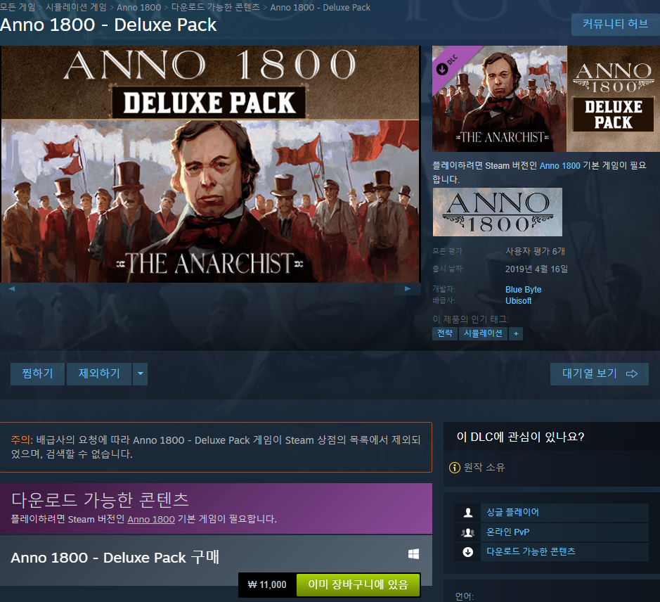 에픽스토어에서 판매중인 아노 1800 컴플리트 에디션을 사면 무정부주의자 DLC가 포함되어 있어요.