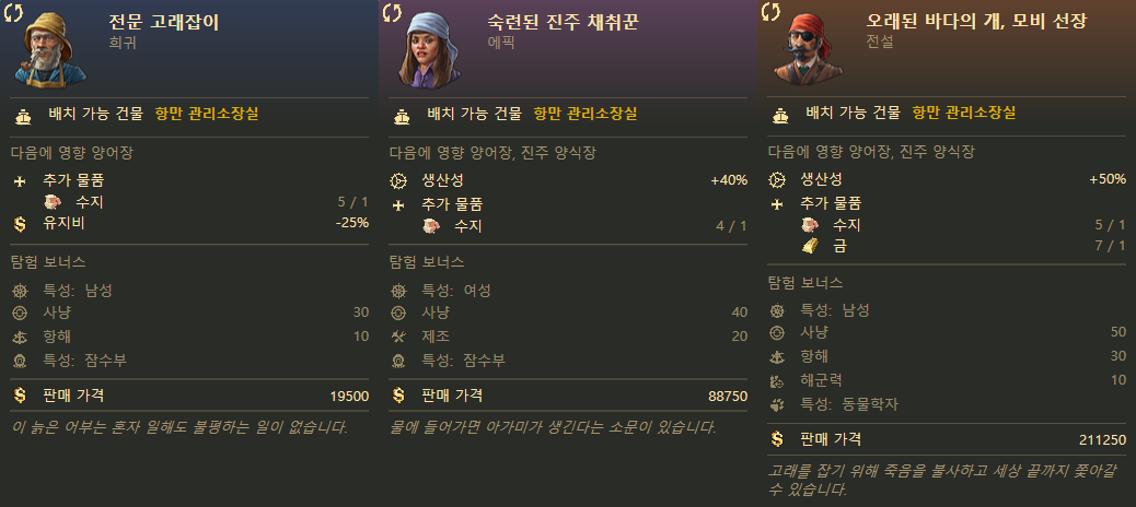 이 중에 특히 "오래된 바다의 개, 모비 선장"이 중요해요. 양어장에서 무려 "금"을 생산해내는 전문가에요. 금 수요가 많지 않은 중반부에는 모비 선장이 생산해내는 금만으로 모든 사치품 수요를 충당할 수 있을 정도에요.