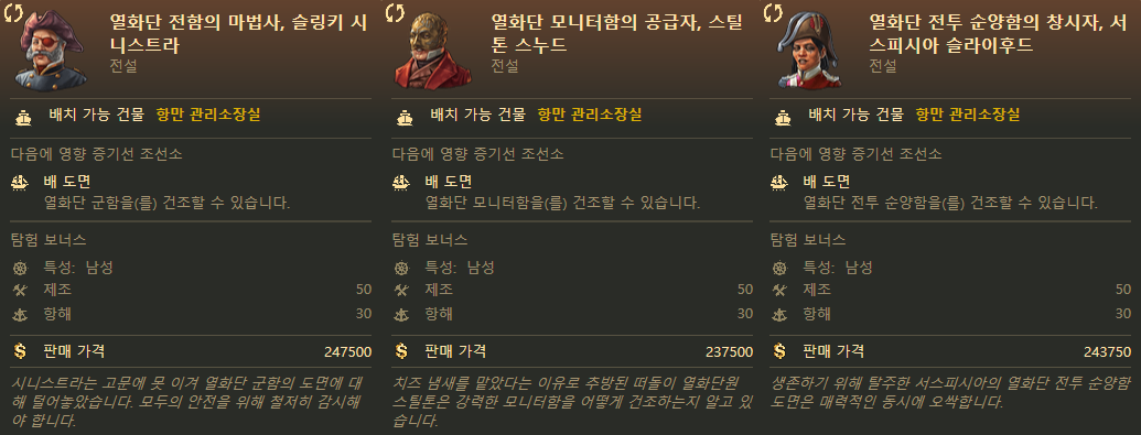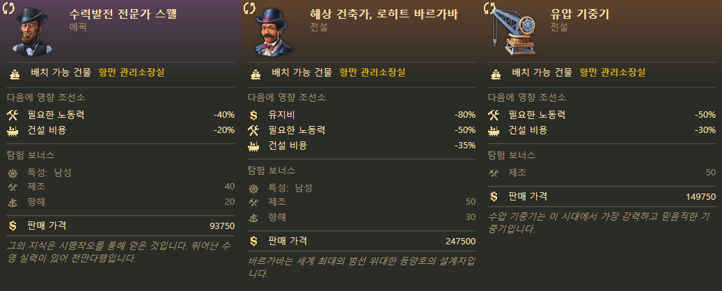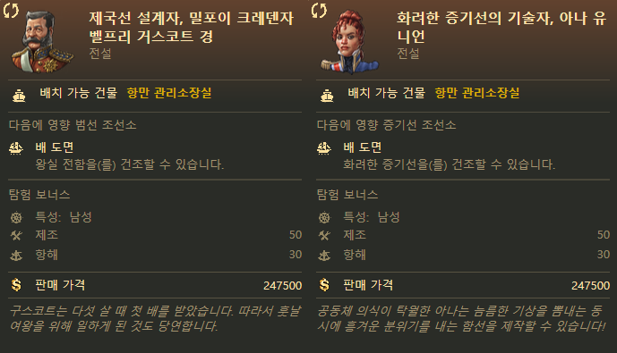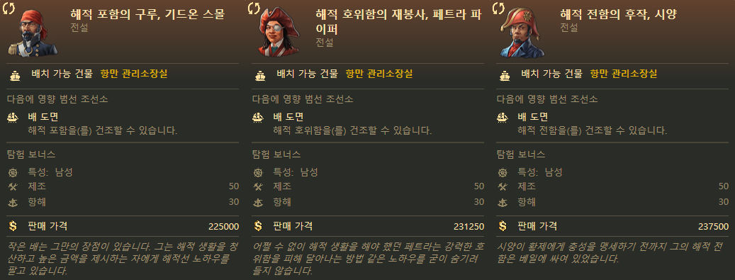 어떻게 보면 별거 아닌 능력처럼 보일 수도 있는데 건설 비용 감소 효과가 합연산으로 들어가기 때문에 셋이 합쳐지면 배를 거의 공짜나 다름없는 가격으로 만들 수 있게 돼요. 후반부에 수 백척의 무역선을 건조할때 큰 도움이 된다요.