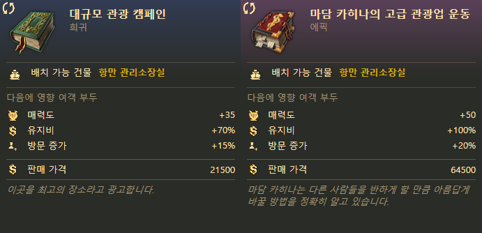 "대규모 관광 캠페인(희귀)" "마담 카히나의 고급 관광업 운동(에픽)"