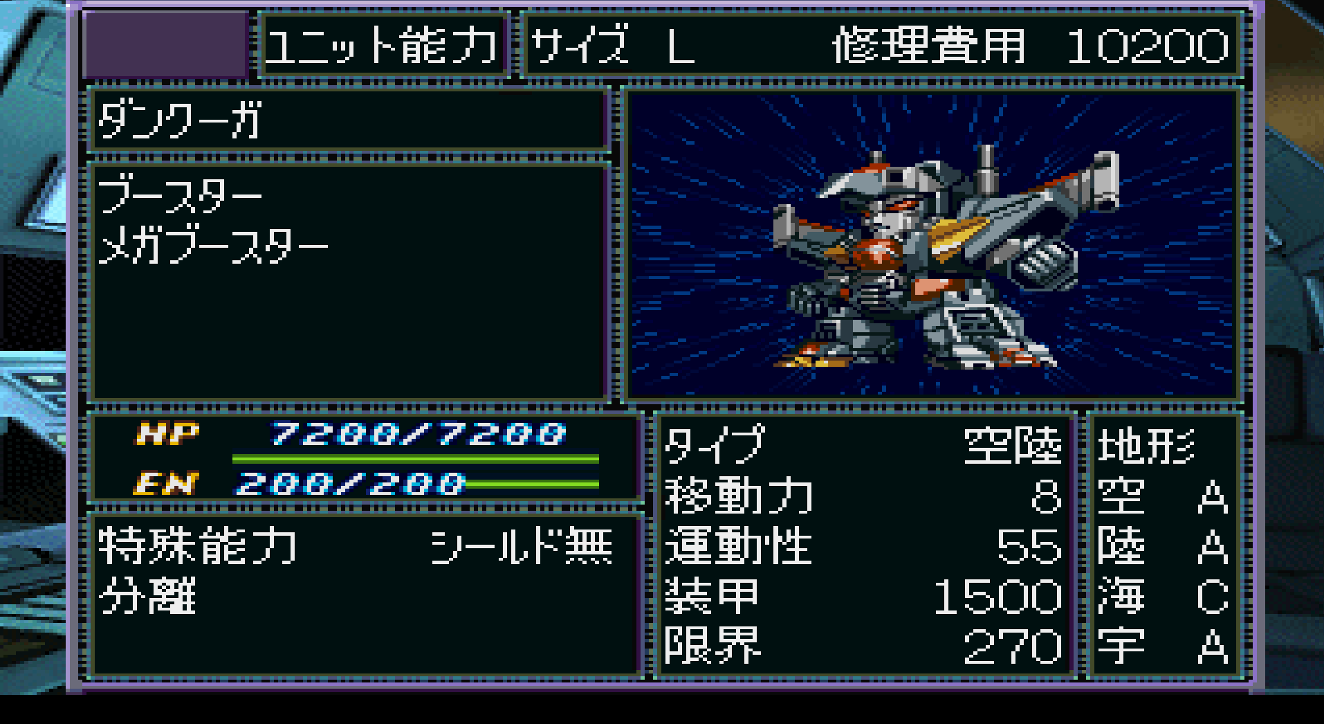 체력 높은 전형적인 슈퍼계열 기체. 좋아하는 사람은 잘 사용하는데 ... 치명적인 단점으로 정신기가 1인분량 밖에 없다는 점이다. 그래도 필살기인 "선어택"의 대미지는 쓸만하다.