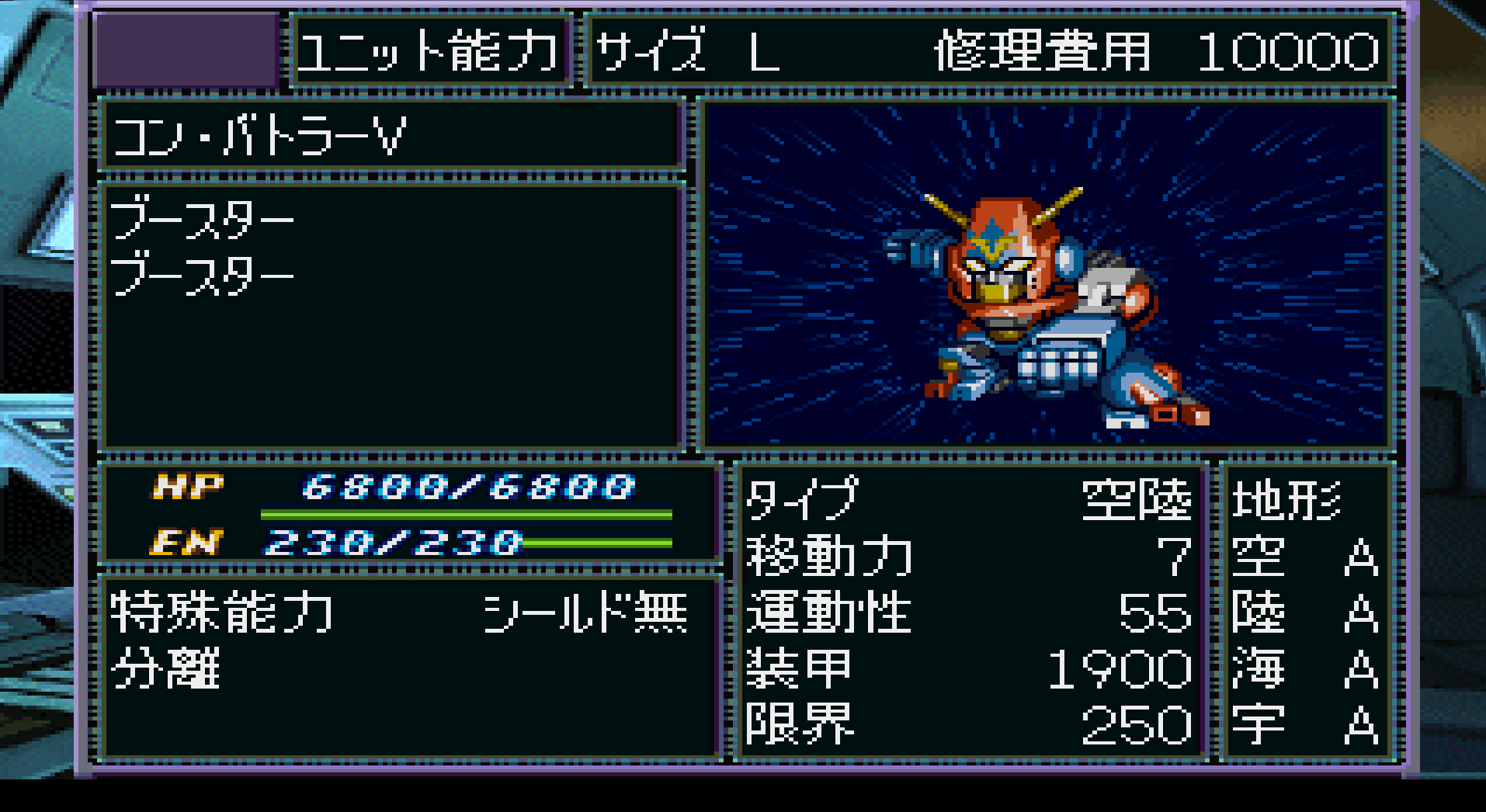 전투 브금은 스페이스 넘버 원인데 ....어째 우주만 올라오면 약해지는 희한한 유닛이다. 필살기인 "고 프랏슈"는 사거리가 길고 대미지도 상당해 쓸만하지만 필요 기력이 130에 소모 EN이 70이나 되기 떄문에 EN 위주로 개조해주는게 좋다. ...그래봐야 한판에 1-2번밖에 안쏘겠지만