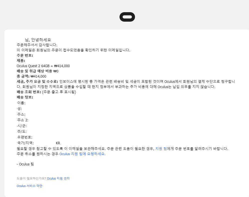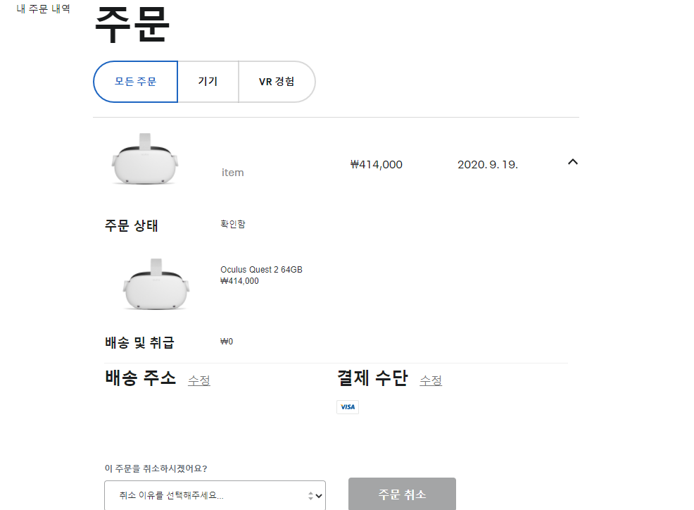 오큘러스 퀘스트 2 홈페이지에서 주문 내역을 확인할때